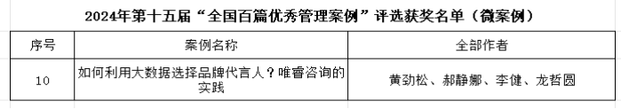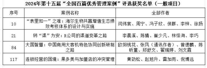 2024年9月9日,在全国工商管理专业学位研究生教育指导委员会的指导下,中国管理案例共享中心主办的第十五届“全国百篇优秀管理案例”评选工作结束。经过同行匿名函审和专家委员会会议评审两轮评审。从179所院校的1512篇投稿中评选出271篇获奖案例。其中:13项重点项目的64篇案例入选第十五届“全国百篇优秀管理案例”(重点案例),141篇案例入选第十五届“全国百篇优秀管理案例”(一般项目),43篇案例入选第十五届“全国百篇优秀管理案例”(微案例),28篇案例入选第十五届“全国百篇优秀管理案例”(西部专项)。