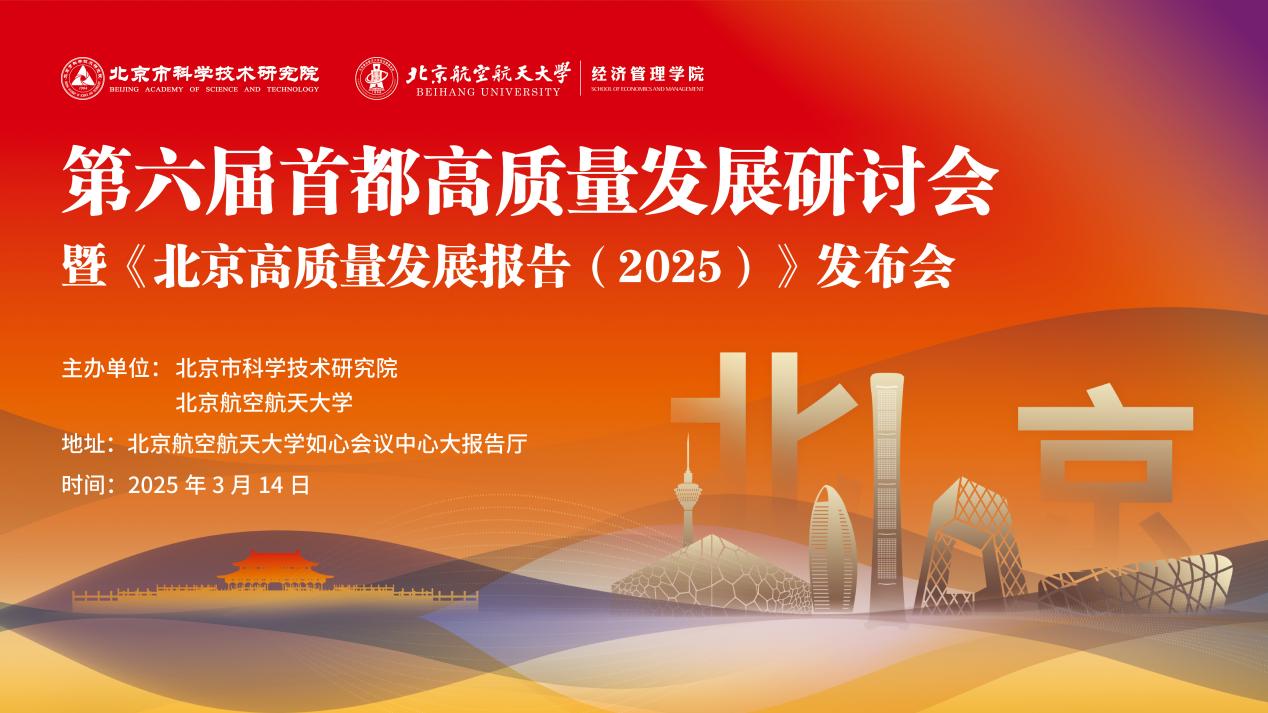 2025年3月14日,由北京市科学技术研究院与北京航空航天大学联合主办、北京航空航天大学经济管理学院与北京市科学技术研究院高质量发展研究中心共同承办的第六届首都高质量发展研讨会在北航如心会议中心大报告厅隆重召开。本次会议围绕创新发展、人工智能、绿色低碳、低空经济等核心议题,汇聚政产学研多方智慧,为首都高质量发展深入研讨,建言献策。